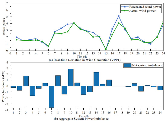 Figure 8a visualizes the source of uncertainty by juxtaposing the forecasted wind power for VPP1 (blue line with square markers) against its stochastic real-time output (green line with circle markers). Significant deviations are observable; for instance, during hours 8–11, the actual generation was consistently below forecast, whereas at hour 15, an un-forecasted surge in wind power occurred. These discrepancies at the individual VPP level are the fundamental drivers of system-wide imbalance.