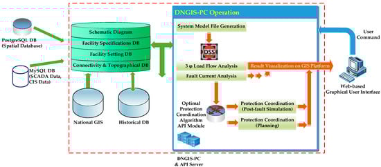 The DNGIS-PC analysis integration platform stores raw data retrieved from automated equipment within the distribution monitoring system in the SCADA MySQL Database. These raw data consist of real-time system dynamic data stored in the historical database. The complete operational workflow of the DNGIS-PC analysis integration platform, including database integration, OpenDSS-based analysis, and protection coordination modules, is illustrated in Figure 3. The platform integrates multiple databases, simulation tools, and web services to support comprehensive analysis and visualization for distribution system operation and protection coordination.