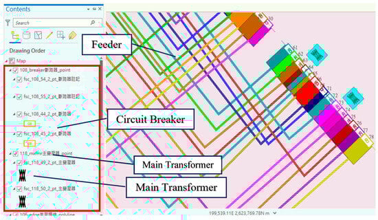 Before building the DNGIS-PC system, the preliminary task involved reading the equipment data from the power company’s original PostgreSQL spatial database. First, the graphical symbols used by the power company need to be replicated in the ArcGIS platform so that the symbols in ArcGIS match those familiar to the power company staff. These symbols allow users to interpret the map data based on their experience without adapting to new system symbols. Table 2 lists several graphical symbols commonly used by the power utility.
