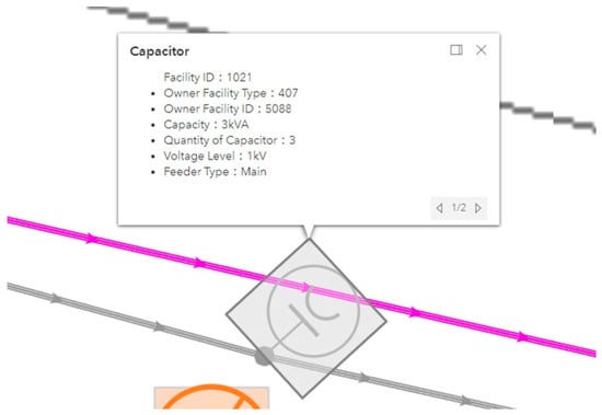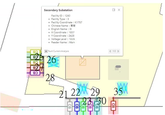 Figure 9, Figure 10 and Figure 11 show the property query interfaces for a secondary substation, a line switch, and a capacitor, respectively. The displayed property data includes the facility ID, voltage level, and the X and Y coordinates of the facility. Figure 9 presents a more comprehensive enlarged view of the secondary substation, featuring three sets of three-phase transformers and several feeder circuit breakers. The switch connection status, capacity, and voltage level are fundamental properties of the tie-line switch observed in Figure 10. Figure 11 demonstrates the property list of the capacitor bank. Each type of equipment recorded in the database has its own specific attribute data, and the attributes differ between various types of equipment.