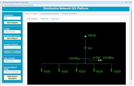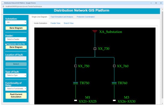 Figure 12 shows the screen after switching from the GIS platform to the single-line diagram, displaying the single-line diagram of the “XA” substation, which includes two main transformers, TR750 and TR760. The white bars labeled M1 and M3 at the bottom of Figure 11 represent icons for extending the single-line diagram display. Clicking on these icons will switch the screen to the view shown in Figure 13. According to Figure 13, the feeder after TR750 connects to five test feeders, XX21, XX22, XX23, XX24, and XX25, through “#1Bus”.