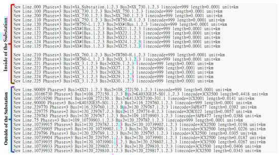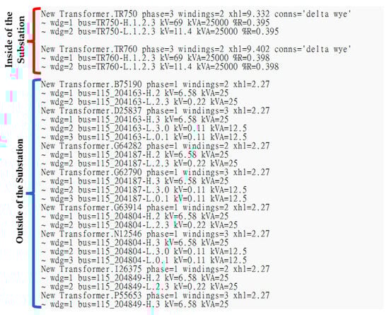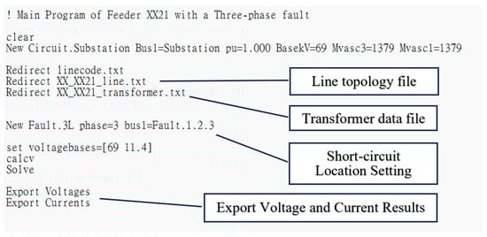The DNGIS platform established in this thesis already has the function of exporting the selected feeder model file. This function must integrate the connectivity of the feeder and various equipment and the relevant data of distributed power sources, load into a file format required by OpenDSS, and set the characteristic parameters of various equipment components. Figure 14 shows the OpenDSS code of the main program format generated by the DNGIS-PC platform, which also performs the three-phase short-circuit fault current analysis at the selected point. Figure 15 and Figure 16 are, respectively, the code segment of the file of the feeder connectivity and the transformer connectivity linked to the same feeder, XX21, as shown in Figure 14. The DNGIS platform will access these two text files while executing the “XX_XX21_S.dss” file, in Figure 14, on the OpenDSS.