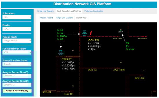 Fault current analysis results display—fault point located on feeder branch line.