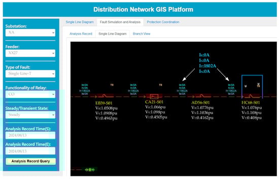Figure 18 shows the fault analysis results for the upstream switch HC68-S01 on the main feeder line of switch DD99-F01. The three-phase voltage values obtained from the fault analysis are displayed below each switch. Above each pair of switches, the three-phase fault currents and the neutral line current are presented.