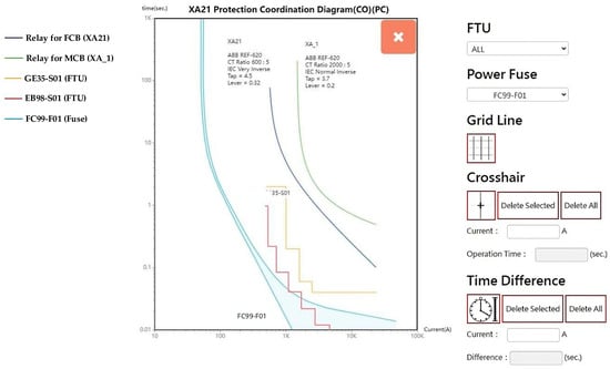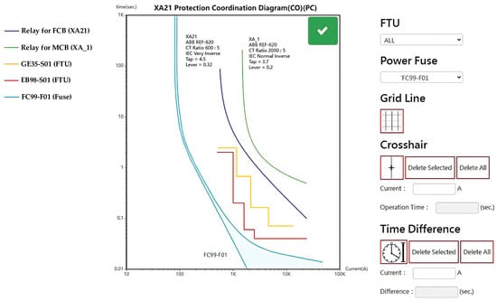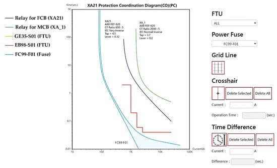 The proposed DNGIS-PC platform directly accesses feeder-related information from various databases maintained by the power utility. This includes critical parameters such as the installation locations and settings of protective relays (e.g., tap and lever positions), current transformer (CT) ratios, FTU operating parameters, and selected ratings of power fuses. These data are essential for accurate offline protection coordination design. Figure 19 illustrates an example of the TCC curves generated under non-fault conditions using the DNGIS-PC platform. The platform visualizes the coordination among multiple protection devices along a feeder, including an MCB relay (XA_1), FCB relay (XA21), FTUs (GE35-S01 and EB98-S01), and a power fuse (FC99-F01). This visualization helps system engineers evaluate the selectivity and coordination margins between upstream and downstream devices before a fault occurs.