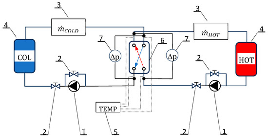 The test stand, the diagram of which is shown in Figure 1, consisted of the tested heat exchanger (6) and two independent working fluid circuits.