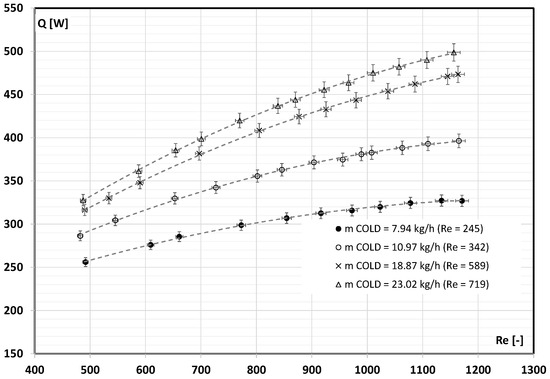 Figure 5 illustrates the effect of the Reynolds number (Formula (5)) on the current thermal power of the exchanger (Formula (1)). It can be seen that, with the increase in the flow rate of hot water, the value of the heat flux exchanged between the fluids increased. It changed from 250 W to 330 W at the lowest flow rate of cold water to a value from 330 W to 500 W at the highest flow rate of cold water.