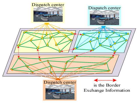 As shown in Figure 3, multi-region distributed optimization is a further refinement of distributed optimization to multiple independent regions (e.g., different geographic regions or power grids). The solution principle of multi-region distributed economic dispatch is that the complete system is divided into several subregions, each of the subregions is optimized independently and in parallel, and the optimal power generation calculated in each region is exchanged through virtual contact lines. Compared with traditional distributed optimization, multi-region distributed optimization enables cross-region wide-scale optimization.