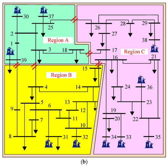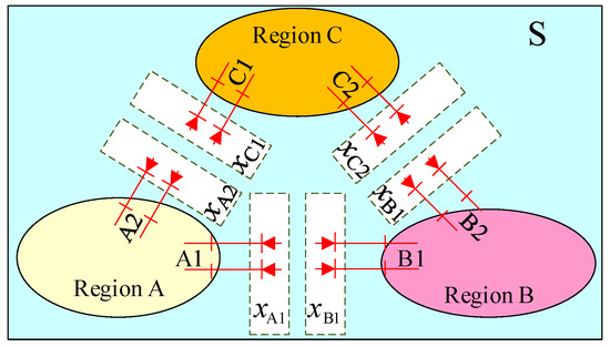 Taking the three-region distributed dispatch system in Figure 4 as an example, the busbar-tearing approach is used to divide the whole system S into three subregions, A, B, and C, and the regions are interconnected with each other through contact lines. A1, A2, B1, B2, C1, C2 are the virtual boundary buses of the corresponding regions; , , , , , are dummy boundary variables for the corresponding regions.