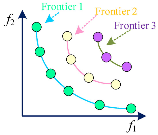 The non-dominated sorting mechanism evaluates the fitness values of the initial populations generated or the solutions generated after the WOA search. The non-dominated sorting mechanism operates as follows: first, the fitness values of the population are traversed, and the set of individuals that are not dominated by any individual is taken as the first frontier and its non-dominated rank is set to 1. Then, among the remaining sets, the set of individuals that are not dominated by any individual continues to be identified and is taken as the second frontier, and its non-dominated rank is set to 2. Subsequently, the remaining sets are traversed again and the above process is repeated, with the sets that are not dominated by any individual as the third frontier, the fourth frontier, etc., in order, and the corresponding non-domination levels are set. This process will continue until all individuals are assigned to different non-dominated ranks. The principle of non-dominated ranking is shown in Figure 5.
