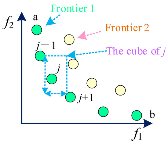 In the iterative process of MGWOA, an increasing number of individuals will gradually result in greater spatial crowding within the archive. Consequently, to preserve population diversity, it is necessary to eliminate individuals with the minimal crowding distances and introduce new ones into the archive, thereby achieving a more optimal Pareto solution set (shown in Figure 6). The approach for calculating congestion distance is presented in Equation (14).