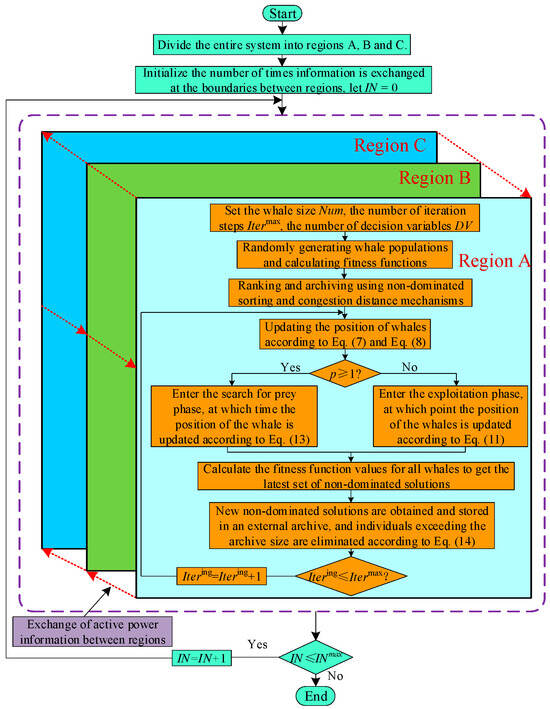 In this study, a multi-region distributed model is introduced in the multi-gradient whale optimization algorithm and MRDMGWOA is proposed. The multi-region distributed optimization approach enables the partitioning of the entire system into multiple subregions, with each subregion undergoing optimization as a cohesive unit through the exchange of merely a portion of the information pertaining to the boundary nodes of the region. The information exchanged between the regions is the active output of the boundary node that acts as a virtual generator after the bus is torn. The computational flow of MRDMGWOA is shown in Figure 7: