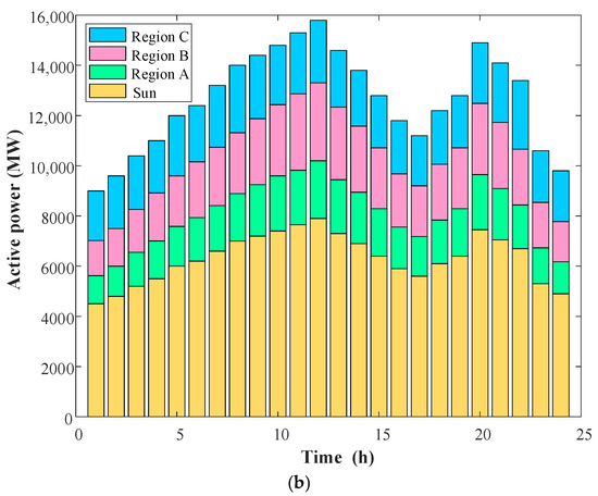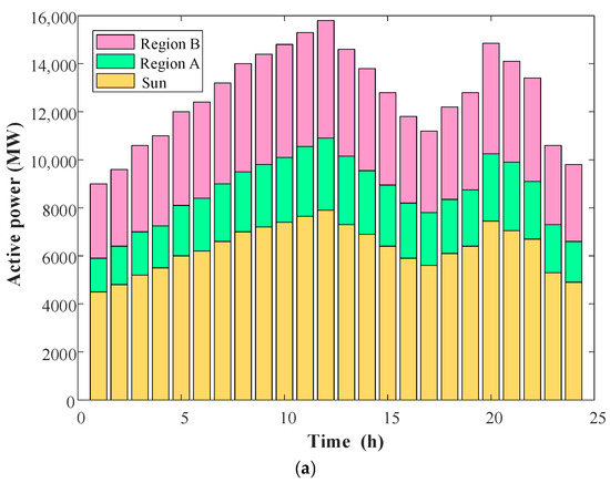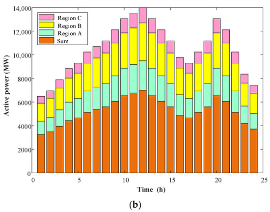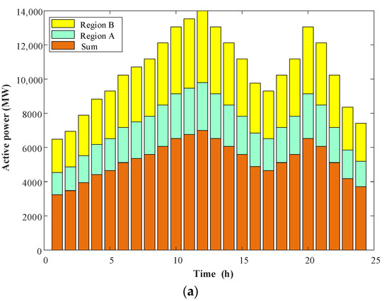 where denotes the total generation cost objective function; denotes the number of thermal power units; denotes the active output of the hth thermal unit in t; is the generation cost of the hth thermal unit in t; T denotes the dispatching period (set to 24 h in this paper); , , and are the quadratic, primary, and constant term coefficients of the cost of generating electricity for the hth thermal unit, respectively.