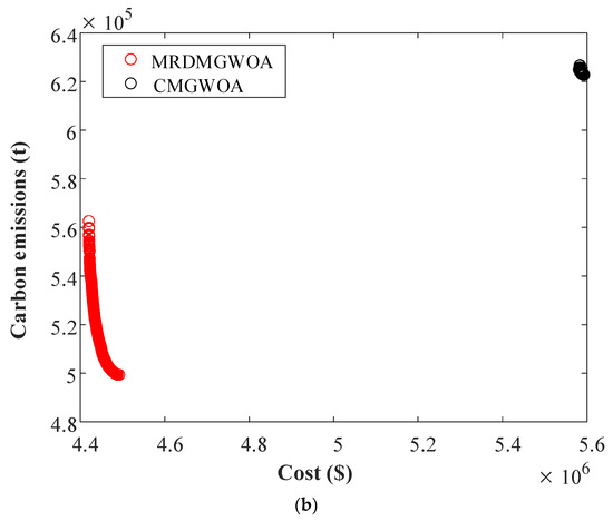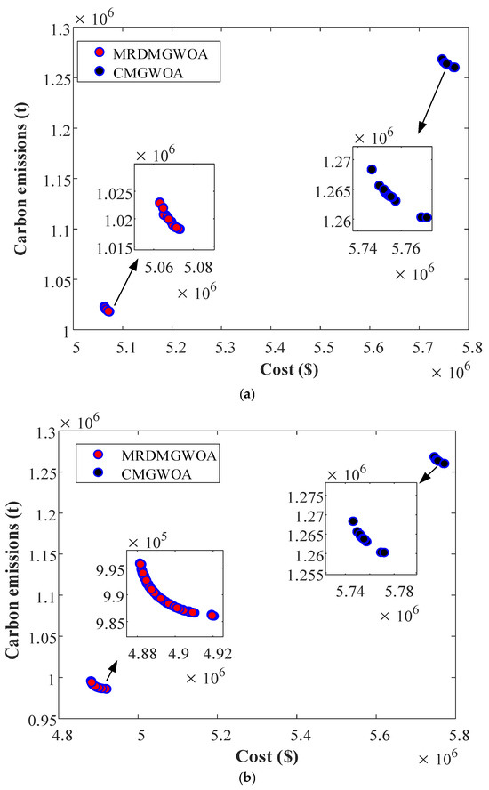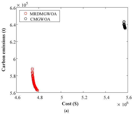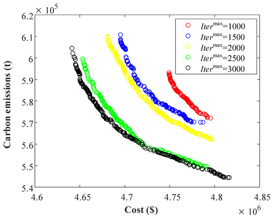 In this section, five different sets of Itermax are set to compare the cost, carbon dioxide emission, and operation time of MRDMGWOA with different Itermax (see Table 13). Figure 19 illustrates the variation of the Pareto curve for MRDMGWOA at different Itermax. As can be seen in Figure 19 and Table 13, as the number of Itermax increases, the MRDMGWOA obtains a more dominant Pareto curve and can also obtain a better ED scheme. However, an increase in Itermax also leads to a longer computation time for MRDMGWOA.