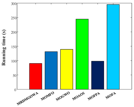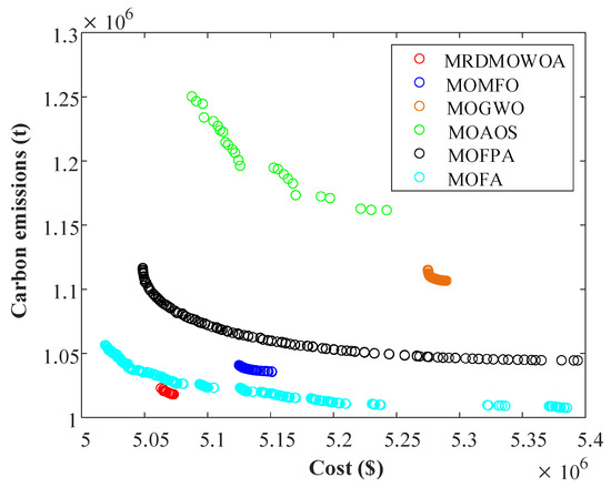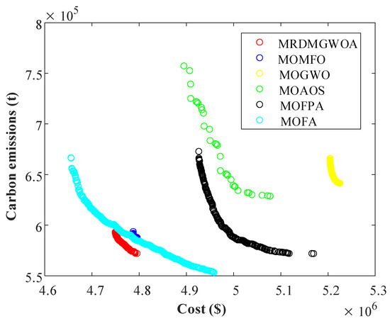 - The Pareto curve generated by MRDMGWOA exhibits a higher degree of dominance compared to those obtained from MOGWO, MOMFO, MOFPA, MOFA, and MOAOS. This implies that MRDMGWOA is capable of achieving greater reductions in both power generation costs and CO2 emissions, thereby offering a more cost-effective operational scenario for the power system.