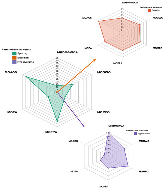 - Across all three performance metrics, MGWOA exhibits excellent convergence behavior and uniform solution quality, with its solution set displaying a markedly higher degree of distributional evenness.