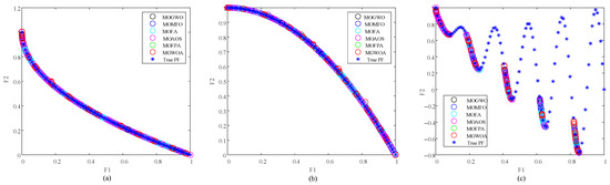 Comparison of Pareto curves of six optimization algorithms for ZDT test function: (a) ZDT1; (b) ZDT2; (c) ZDT3.
