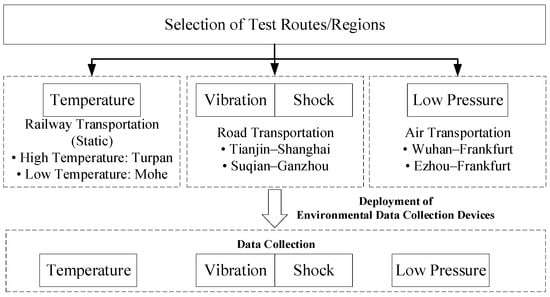 To verify whether current standards accurately reflect actual transport conditions in terms of key environmental parameters (i.e., temperature, vibration, shock, and low pressure), we focused on the extreme environmental conditions encountered during three typical modes of transportation: road, rail, and air. Field measurements of the transport environment were conducted accordingly. The schematic of the experimental procedure is shown in Figure 1.
