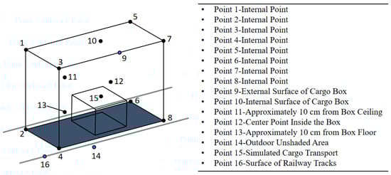 Tests were conducted in August 2024 (Turpan) and January 2025 (Mohe). A standard 20-foot container was used as the test unit, with 16 sets of environmental data acquisition devices placed inside and outside the container. Sensor positions included the container centre, corners, floor, and roof, as shown in Figure 3. The sampling interval was 5 min. A spatially uniform distribution strategy was used to capture temperature gradient data. During data processing, intervals with the highest temperature change rates were selected as analysis samples.