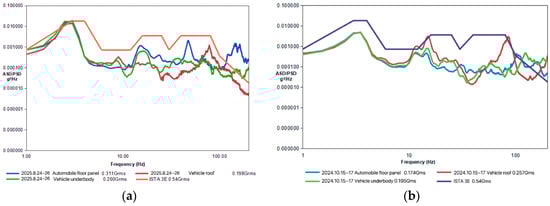 After processing, over 50,000 road profile data entries were obtained, with root mean square acceleration; g (Grms) as the primary parameter. Based on these data, PSD curves for the Tianjin–Shanghai and Suqian–Ganzhou routes were generated (Figure 5). These plots provided clearer and more intuitive insights into the vibration characteristics experienced by the vehicle across different road segments.