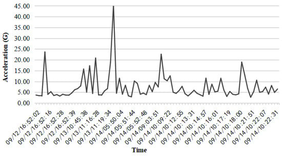 As illustrated in Figure 4, vibration characteristics vary by vehicle location. Overall vibration levels on the Suqian–Ganzhou route were lower than those on the Tianjin–Shanghai route, particularly in the low-frequency range (1–10 Hz), where PSD peak values were reduced. In the mid-to-high-frequency range (10–100 Hz), PSD curves from both routes exhibited similar trends, characterised by multiple resonant peaks. To further analyse the vibration profile, the acceleration variation curve for the Tianjin–Shanghai route is presented in Figure 6. The maximum impact acceleration at the vehicle floor reached 44.06 g, indicating relatively severe shock conditions along the route. In contrast, the maximum impact acceleration for the Suqian–Ganzhou route was only 19.93 g at the floor, with peak values of 22.11 g at the roof and 27.34 g at the underbody, all of which were lower than those recorded on the Tianjin–Shanghai route, suggesting that the road conditions exerted less impact-related stress on the vehicle. These variations in test data highlight the need for further optimisation of testing standards for the transportation safety evaluation of lithium-ion batteries, with consideration of the actual vibration scenarios across different transportation routes to enhance their applicability.