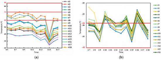 Measured temperature curves for the (a) Turpan high-temperature test and (b) Mohe low-temperature test. The legends indicate the corresponding points seen in Table 3.