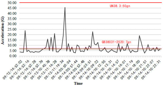 Based on the measured data from the Tianjin–Shanghai route, a total of 1237 valid impact events (acceleration ≥ 5 g) were recorded. Statistical distribution analysis (Figure 9) showed that approximately 12.3% of these events exceeded the 7 g limit specified by GB38031, while all values remained below the UN38.3 thresholds for large batteries (50 g) and small batteries (150 g).