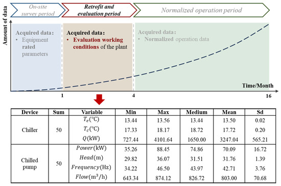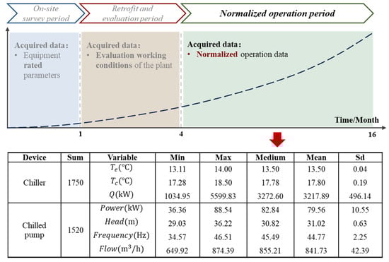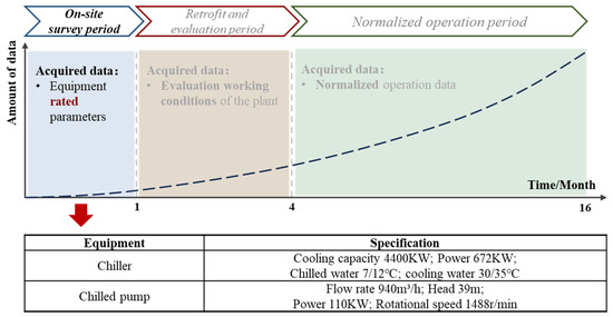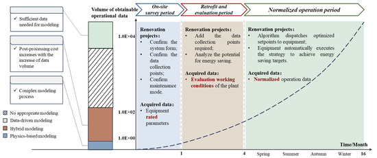 The energy-saving retrofitting of a chiller plant is a long-term project that consists of three stages. The duration from the start of the renovation to its completion was approximately one and a half years. Throughout the energy-saving renovation process, there were significant differences in the issues to be addressed and the data and information available at each stage, as represented in Figure 1.