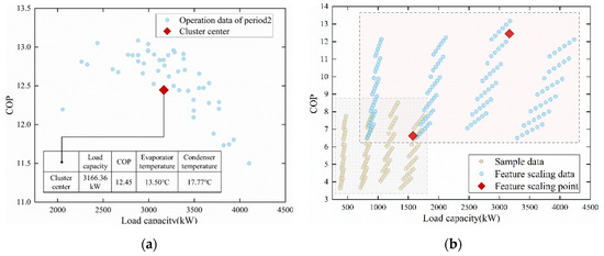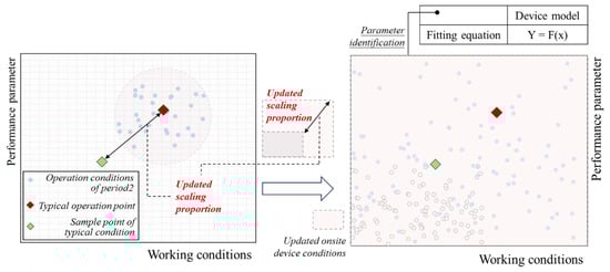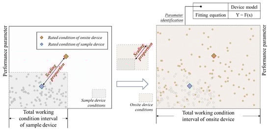 Retrofit and evaluation period: The operation data of the refrigeration plant in various typical terminal environments were obtained, and the collected data were often more representative of the actual operating condition interval of the equipment, which can cluster the working condition data collected from multiple fields of debugging into a typical working condition point. The idea of generating field equipment data points continues from the previous stage. If there is a sample manual of the corresponding equipment as a reference for the operation state of the entire operating range, the dataset will be generated based on the sample manual. If the sample manual cannot be obtained, the method of collecting samples of the same type of equipment will be adopted, and the typical operating points obtained by clustering will replace the rated parameters of the field equipment as the scaling characteristics. The general sample set will be scaled, as represented in Figure 4, and the scaled data will be used to represent the dataset of the entire operating range of the field equipment.