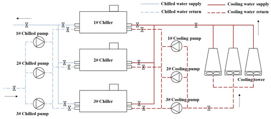 Energy consumption has increased sharply worldwide and is expected to continue increasing in the future [1]. Building energy consumption is an essential component of overall energy consumption, and Heating, Ventilation, Air-conditioning, and Cooling (HVAC) systems account for a large proportion of energy consumption. Central air-conditioning systems are widely used to cool commercial buildings [2], office buildings, and factories [3]. The refrigeration plant of a central air-conditioning system includes water chillers, boilers, cooling towers, and other equipment that converts fuel or electric energy into the heat or cooling capacity required by buildings. Many refrigeration plants in existing buildings possess low energy efficiency due to their lengthy construction, aging equipment, and improper operation and maintenance methods. Improving the operating efficiency of equipment is required for energy-saving retrofitting of existing low-efficiency refrigeration plants [4,5] and is based on the development of an energy consumption model for equipment operation in refrigeration plants.