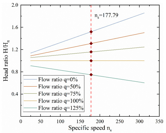 The relationship between the specific speed and head ratio of a general centrifugal pump under different flow ratios is represented in Figure 11.