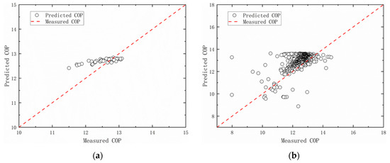 Comparison between the predicted values of the COP model and the actual operational data of the chiller. (a) In the retrofit and evaluation period. (b) In the normalized operation period.