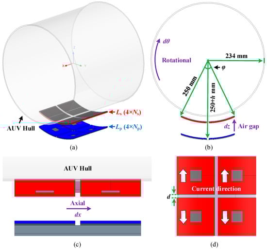 The magnetic coupler constitutes the cornerstone of underwater WPT systems, with its electromagnetic characteristics dictating the overall power transfer performance [28]. To address the hydrodynamic contour constraints of AUV hulls, a novel coaxial antipodal dual DD (CAD-DD) coil configuration serves as the core coupler architecture. Figure 1 illustrates this topology while defining three critical misalignment degrees of freedom: rotational misalignment (dθ), axial displacement (dx), and vertical air-gap variation (dz). Accounting for underwater operational requirements, a precisely engineered inter-coil clearance d mitigates hydrostatic pressure on the waterproof housing. More details will be discussed in Section 5.