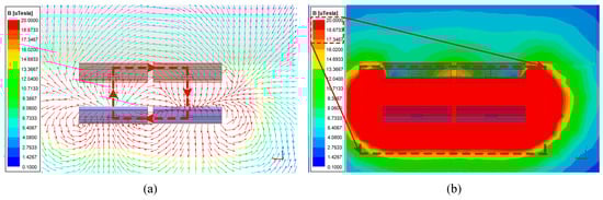 Magnetic field distribution in XZ plane: (a) spatial distribution of magnetic field lines; and (b) distribution of magnetic flux density.