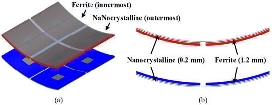 Beyond the coil geometry, magnetic core implementation demands the resolution of competing objectives: saturation resilience, receiver mass minimization, magnetic reluctance reduction, and high-frequency loss suppression. A hybrid ferrite–nanocrystalline laminated core structure tailored to the CAD-DD spatial profile resolves these requirements, as depicted in Figure 3. Ferrite segments interface directly with each DD coil winding periphery, conforming precisely to the four active regions. Nanocrystalline ribbons laminate onto exterior ferrite surfaces, strategically bridging interstitial zones between adjacent DD coil sections. This configuration establishes a continuous low-reluctance magnetic circuit while suppressing flux leakage. Critically, the layered material sequence—ferrite innermost, nanocrystalline outermost—exploits distinct electromagnetic properties. Initial flux penetration through high-permeability ferrite substantially attenuates the field intensity within the nanocrystalline material, effectively minimizing the characteristic eddy current losses [29]. Concurrently, the exterior nanocrystalline layer capitalizes on the exceptional specific saturation flux density [30]. Implementation of ultra-thin (0.2 mm) nanocrystalline laminates consequently achieves significant power density gains with a minimal associated mass penalty for host AUV platforms.