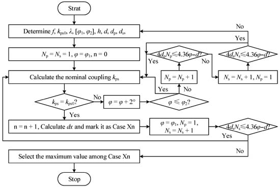 The axial misalignment optimization procedure (Figure 4) initiates with specification of the system constants: operating frequency (f), nominal coupling coefficient (kps0), required fluctuation ratio (λ), angular bounds [φ1, φ2] (determined by the operational depth requirements and kps0), fixed transmission distance (h), fixed gap (d), and conductor diameters (dp, ds). A progressive angular iteration sweeps φ across [φ1, φ2] in 2° increments. For each φ value, exhaustive Np-Ns combinations undergo electromagnetic validation to identify parameter sets satisfying kps0 and arc length constraints at a 250 mm radius: 4dpNp ≤ 4.36φ-d and 4dsNs ≤ 4.36φ-d. All the valid tuples (φ, Np, Ns) are recorded and indexed (n = 1, 2, …N). Post-screening, each valid set undergoes misalignment robustness validation through axial displacement simulation (dx). This identifies the critical offset position (Xn) where minimum coupling (kmin) occurs. The core optimization target maximizes Xn to enhance the positional uncertainty tolerance. The optimal solution selects the parameter tuple achieving the maximum Xn. For equivalent Xn maxima, staged prioritization applies: first minimal φ (reducing eddy current losses), then minimal Ns (lowering receiver mass), and finally, minimal Np (optimizing transmitter compactness)—reflecting the electromagnetic loss hierarchies while addressing the multidimensional coupling complexities that preclude closed-form solutions.
