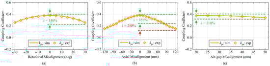 Simulated and measured coupling coefficients varying with misalignments: (a) rotational misalignment; (b) axial misalignment; and (c) air-gap misalignment.