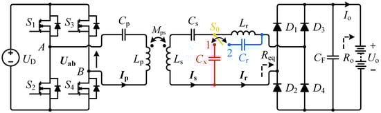 Synergistically integrated with the CAD-DD coil, this work proposes a reconfigurable detuned S-LCC/S compensation topology, as depicted in Figure 6. The key components include the following: DC voltage source UD, inverter switches S1–S4, rectifier diodes D1–D4, filter capacitor CF, and battery-equivalent load Ro. The primary and secondary coils exhibit self-inductances Lp and Ls, respectively, coupled with mutual inductance Mps. The circuit currents are denoted as Ip, Is, and Ir, while the compensation elements comprise the capacitors (Cp, Cs, Cx, Cr) and inductor Lr. A single-pole double-throw (SPDT) relay S0 switches between Cx and Cr. The inverter’s fundamental output voltage is Uab, with Req representing the equivalent AC load preceding the rectifier.