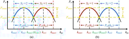 Implementation of P-k curve interconnection for dual reconfiguration modes: (a) kmin2 < kmax2 = kmin1 < kmax1; and (b) kmin1 < kmax1 = kmin2 < kmax2.