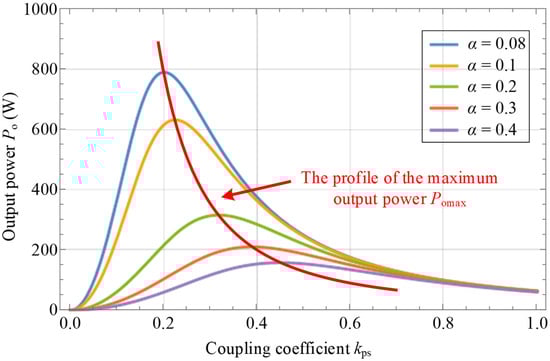 To isolate α’s influence, Figure 9 plots Po vs. kps using Mode II’s power Equation (15) (a function of α) with Lp = 80 μH, Ls = 70 μH, f = 85 kHz, Ro = 10 Ω, UD = 100 V. The key observations are as follows: