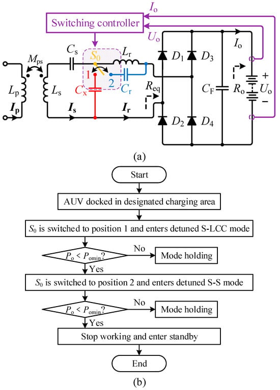 Based on the design configuration shown in Figure 8a, the relay S0 should initially engage Position 1 (detuned S-LCC topology) when the AUV is perfectly aligned. During rotational, axial, or air-gap misalignment, the S-LCC topology may fail to sustain stable power output (falling below the minimum allowable power Pomin). At this threshold, S0 switches to Position 2 (detuned S-S topology) to maintain stable power transmission. If misalignment further increases and the S-S topology’s output drops below Pomin, the AUV is deemed to be outside the preset operational range (kps < kmin2 or kps > kmax1). The WPT system then enters a quiescent state, suspending power transfer. This mode switching strategy is detailed in Figure 10.
