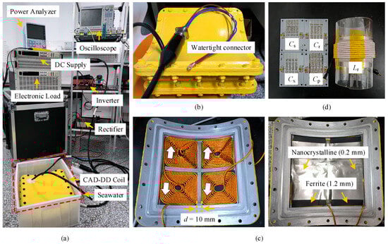 Experimental prototype: (a) overall setup; (b) waterproof and compressive shell; (c) coil structure; and (d) compensation component.