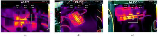 Infrared thermal imaging diagrams of key components (at the 120 min): (a) inverter; (b) Cp; and (c) rectifier.