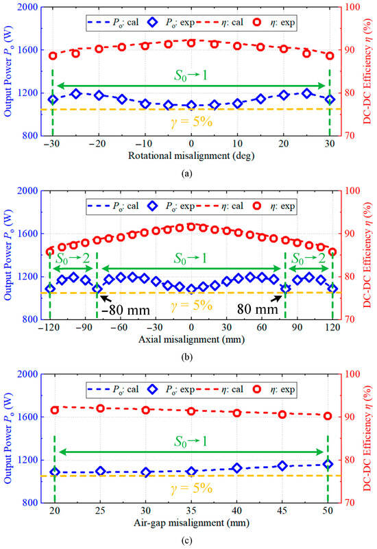 Calculation and experimental results of output power and DC–DC efficiency with misalignments: (a) rotational misalignment; (b) axial misalignment; and (c) air-gap misalignment.