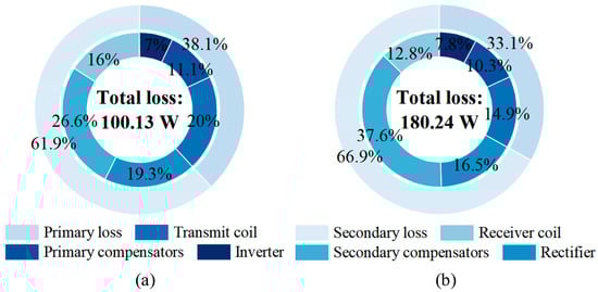For axial misalignment, Figure 13b demonstrates stable power delivery in Mode I within dx ≤ 80 mm. Beyond this threshold (dx > 80 mm), S0 switches to Position 2 (detuned S-S topology) to maintain stable power. At the maximum tested axial offset (dx = 120 mm), the output power ranges between 1088.24 W and 1198.51 W. Based on the power fluctuation definition in (17), the variations remain within the designed 5% limit, validating the stable power transmission across wide misalignment ranges. System efficiency exceeds 85% across all the misalignment scenarios, including the most severe case at dx = 120 mm, peaking at 91.56% under perfect alignment. At the critical switching point (dx = 80 mm), both the output power and efficiency transition smoothly between topologies without abrupt jumps, verifying the effectiveness of the proposed parameter design. The power loss distributions at efficiency extremes (Figure 14) across six components—inverter, primary compensators, transmit coil, receiver coil, secondary compensators, and rectifier—reveal magnetic coupler losses (transmit and receiver coils) as the dominant contributor at >30% of the total loss. The secondary compensators emerge as the secondary loss source, exceeding the semiconductor switching losses.