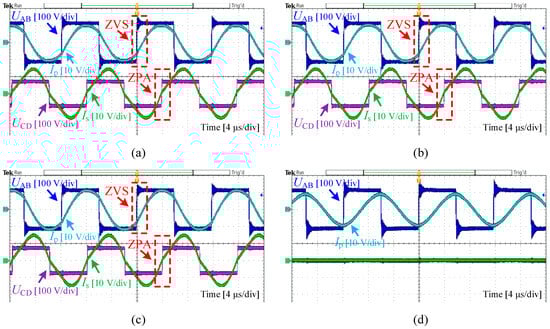 Figure 15 displays the steady-state waveforms of the inverter voltage Uab/current Ip and rectifier voltage Ucd/current Is under four conditions: rated operation, 80 mm/120 mm axial offsets, and full AUV detachment. Analysis confirms ZVS in the primary MOSFETs and sustained zero phase angle (ZPA) output on the secondary side across all the cases, ensuring efficient power transfer. As derived from (23), the input impedance phase angle increases from 29.68° to 36.12° with growing misalignment severity, aligning with theoretical predictions. During full detachment (Mps→0), Ip rises moderately without an exponential surge, maintaining system stability as anticipated. However, the elevated current generates strong magnetic fields that may disrupt AUV electronics, necessitating a protection circuit to halt inverter operation. These results demonstrate robust power delivery from alignment through extreme misalignment to detachment, while highlighting critical safety protocols for practical deployment.