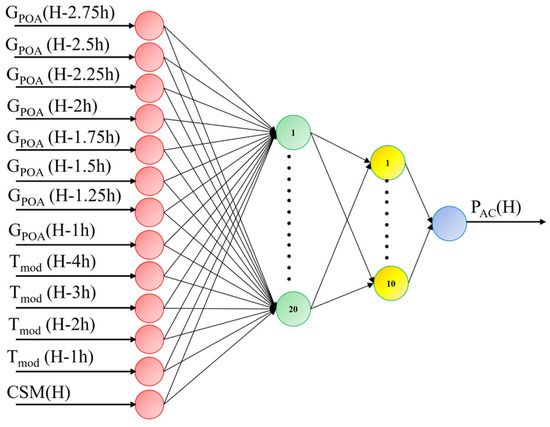 In this section, the design of the HPANN model [21], based on an ANN and the CSM, used for the (H-1) PAC forecasting, is described in detail. The number of inputs and their respective time resolutions have been determined through a trial-and-error approach, aiming to balance forecasting accuracy and model simplicity. The designed MLP neural network consists of a two-hidden-layer structure comprising 20 and 10 neurons [21]. Training performance is quantified using the Mean Squared Error (MSE) metric. A maximum of 500 training epochs is allowed, with early stopping based on a validation check criterion set to 10 consecutive failures. Both the hidden and output layers employ a radial basis activation function. The learning process is governed by the Levenberg-Marquardt backpropagation algorithm, which also handles weight and bias updates through its optimization strategy. The selection of key hyperparameters, such as training duration, hidden layer size, number of neurons in the hidden layer, and learning rate, was performed through empirical tuning based on trial-and-error experimentation. For example, for the selection of the number of hidden layers, 1 to 3 hidden layers have been tested, considering that an insufficient number of hidden layers may lead to underfitting, limiting the model’s ability to capture complex patterns, while an excessive number can cause overfitting and increase computational complexity without guaranteeing performance improvements. In order to choose the number of neurons, based on empirical heuristics such as the geometric and arithmetic means of the input and output layer sizes, a range of 5 to 30 neurons has been tested for the first hidden layer and 5 to 15 for the second. The final configuration with two hidden layers, with 20 and 10 neurons, respectively, yielded the best forecasting accuracy. This structure provides adequate ability to model complex nonlinear relationships in the data, while empirical tuning combined with validation-based early stopping was employed to reduce the risk of overfitting. While this heuristic method, based on a trial-and-error approach, lacks formal optimization guarantees, it remains a commonly adopted strategy for configuring ANNs in practical applications, particularly when the dimensionality of the search space is manageable and domain-specific expertise can guide the search. Nevertheless, future work may benefit from the integration of more systematic tuning strategies, such as metaheuristic optimization algorithms (e.g., genetic algorithms, Bayesian optimization), to further improve forecasting performance [31].