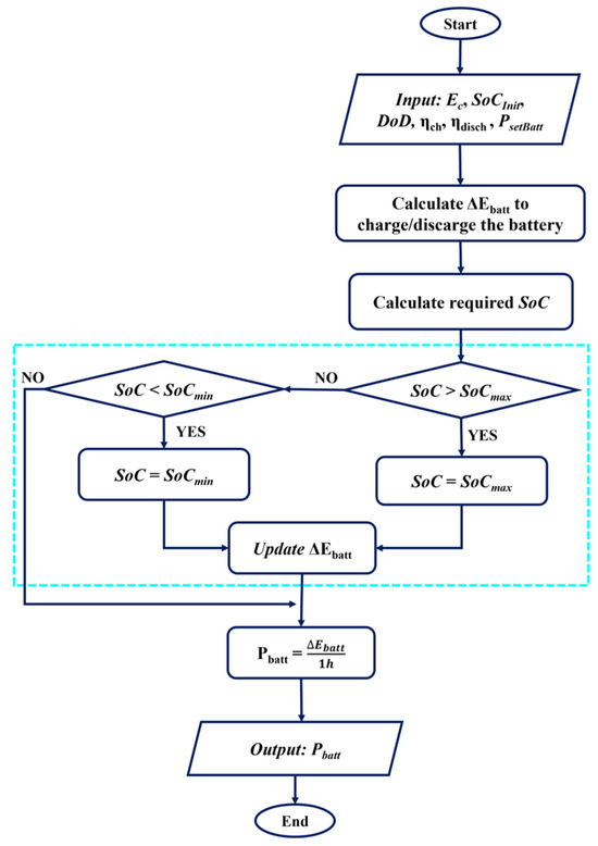 - Battery modelling. A simple battery model based on the Coulomb Counting Method [29] is adopted to estimate the state of charge (SoC). It expresses the SoC as a function of energy, rather than just current, thus allowing a more direct representation of the remaining energy, and accounts for variations in the battery’s voltage. The implemented model ensures that the battery operates within technical limits, including SoC boundaries (SoCmin and SoCmax), charge/discharge efficiencies (ηch and ηdish), and depth of discharge (DoD). DoD is the percentage of the nominal battery capacity, Ec, actually usable. The SoC is updated at each time step based on the net energy exchanged in a 1-h period. Figure 2 illustrates the flow chart of the Battery function used in the flow chart of the first and second battery strategy considered for imbalance mitigation (Figure 3 and Figure 4), where: