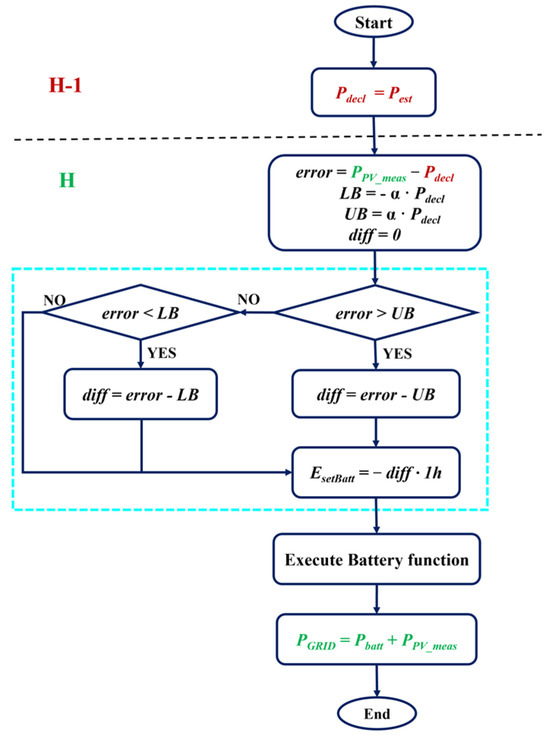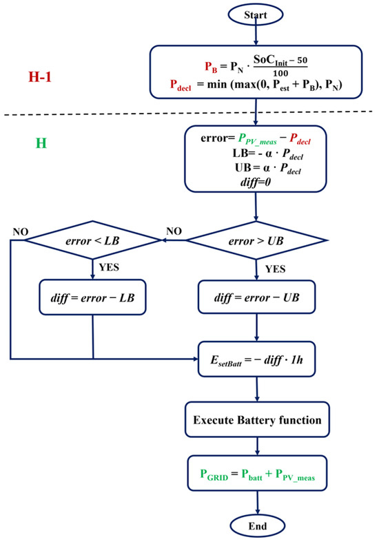 - The second battery compensation strategy differs from the previous one only in Pdecl calculation: in this case, Pdecl depends on the forecasted and the energy stored in the battery at H-1. More specifically, the strategy tries to keep the battery SoC always close to 50%. This approach improves the ability of the battery to compensate for many consecutive underestimations or overestimations due to forecasting errors. Therefore, the declared power is greater than the forecasted one when the SoC exceeds 50%, while it is lower than the forecasted power if the SoC is below 50%. Different from the previous greedy battery compensation strategy, this strategy improves the long-term consistency and reliability of imbalance mitigation and better ensures compliance with tolerance thresholds. Figure 4 shows the flow chart of the second battery compensation strategy. In particular, the variables shown in red refer to quantities computed at time H-1, whereas those in green at time H. PN is the nominal power of the PV system, while PB is the power that must be supplied to/provided by the battery in order to restore the SoC to 50%. It is worth noticing that PB, computed at H-1, is different from the actual power Pbatt, which is supplied to/provided by the battery at time H.