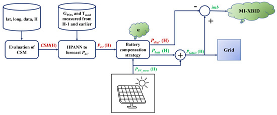 Finally, Figure 5 presents a block diagram illustrating the proposed methodology. First, the Clear Sky Model (CSM) is computed based on the latitude (lat), longitude (log), date, and specific time (H) corresponding to the PAC to be forecasted. This value, along with the other inputs, which are GPOA and Tmod from H-1 and preceding, is the input of the HPANN model, which provides Pest. Then the declared power is evaluated according to the battery strategy and notified to the market. At hour H, the actual power output of the PV system is measured, PPV_meas. Based on the comparison between the measured and estimated values, the battery is charged or discharged according to compensation strategies (Figure 2 and Figure 3), to try to ensure that the power supplied to the grid (PGRID) implies a charge imbalance within the tolerance threshold or is entirely eliminated.